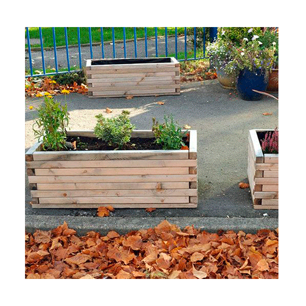 Conjunto de 4 macetas sencillas y resistentes para los patios de las escuelas. Gran tamaño para que varios alumnos pueda trabajar grupalmente. Ideales para desarrollar diferentes actividades mediante el aprendizaje de la siembra y la cosecha. Los alumnos también pueden desarrollar sus dotes artísticas pintando las jardineras. También se pueden añadir espejos con diferentes formas para decorarlas.